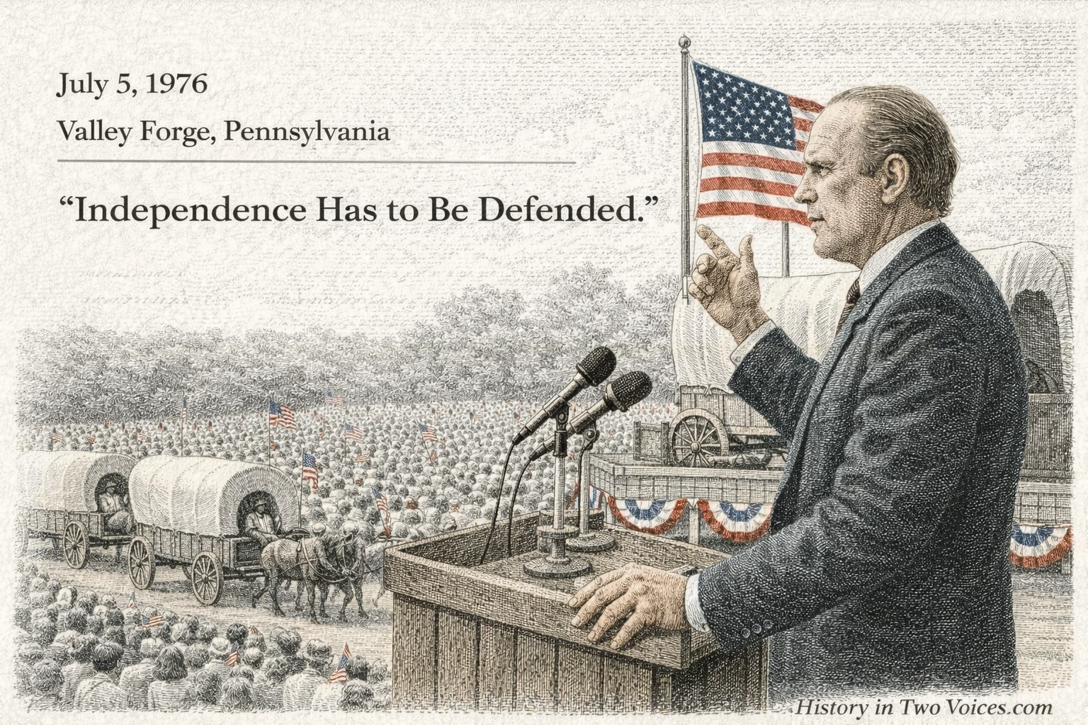 On July 5, 1976, President Gerald Ford delivered a powerful address to the 25,000 spectators gathered at Valley Forge. His words, “Independence has to be defended as well as declared,” he stated. “Freedom is always worth fighting for and liberty ultimately belongs only to those willing to suffer for it,” captured the essence of the Bicentennial Wagon Trains and the larger celebration of American history. Ford’s message reminded the nation that liberty and freedom are not guaranteed—they must be actively defended and cherished. His speech resonated deeply with the spectators, adding an official voice to the commemoration of the nation’s founding.