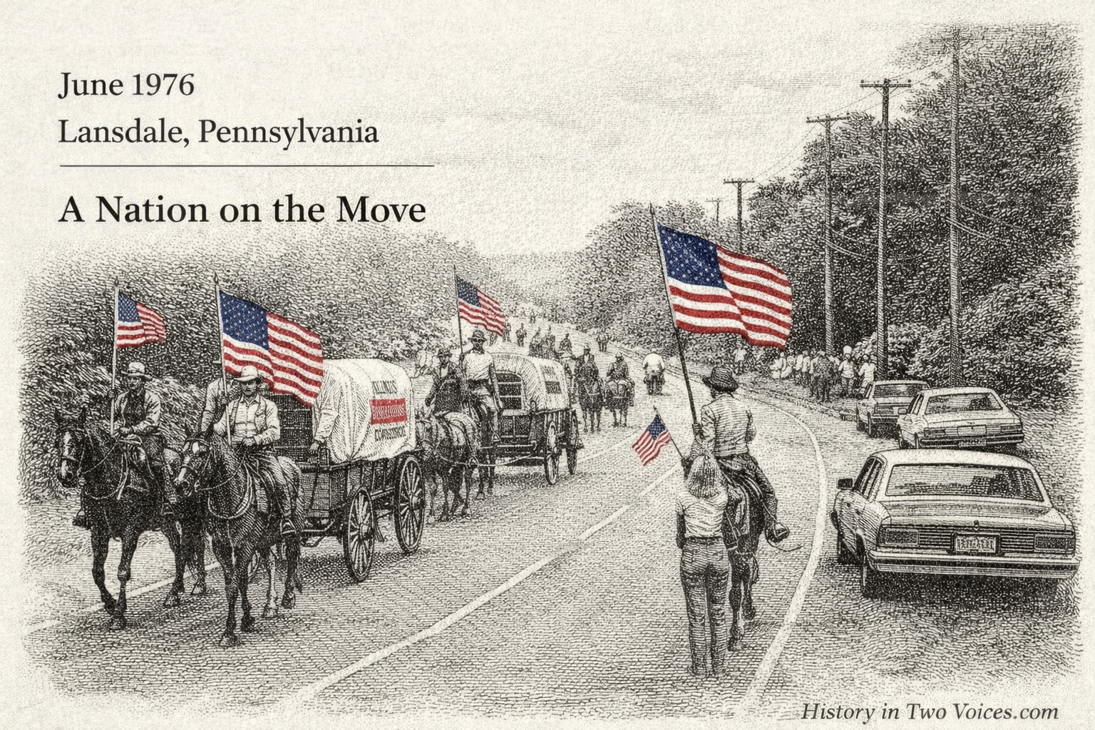 Wagon Train Procession, Lansdale, Pennsylvania, June 30, 1976. Inspired by coverage in The Reporter (Lansdale, PA), June 30, 1976. Computer-generated illustration created for History in Two Voices.