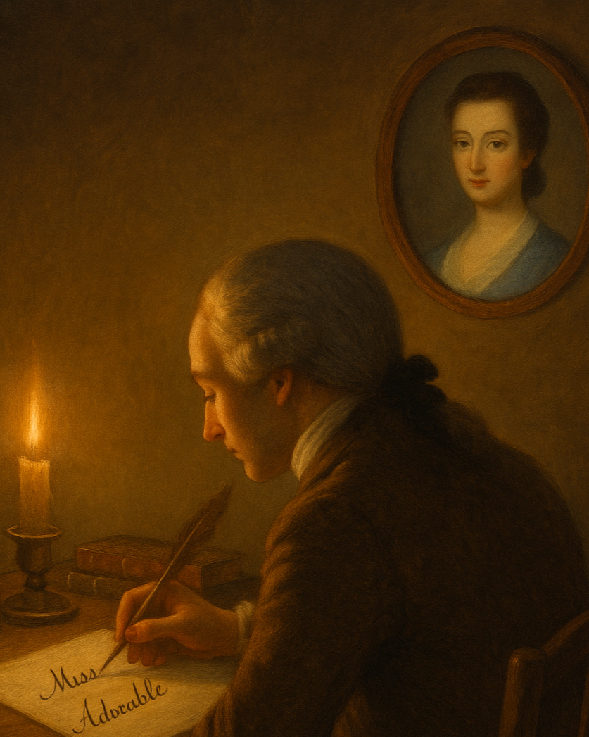 “Miss Adorable.” Interpretive illustration of John Adams composing a letter to Abigail Smith, inspired by eighteenth-century portraiture and period correspondence. Created for History in Two Voices, 2025.
