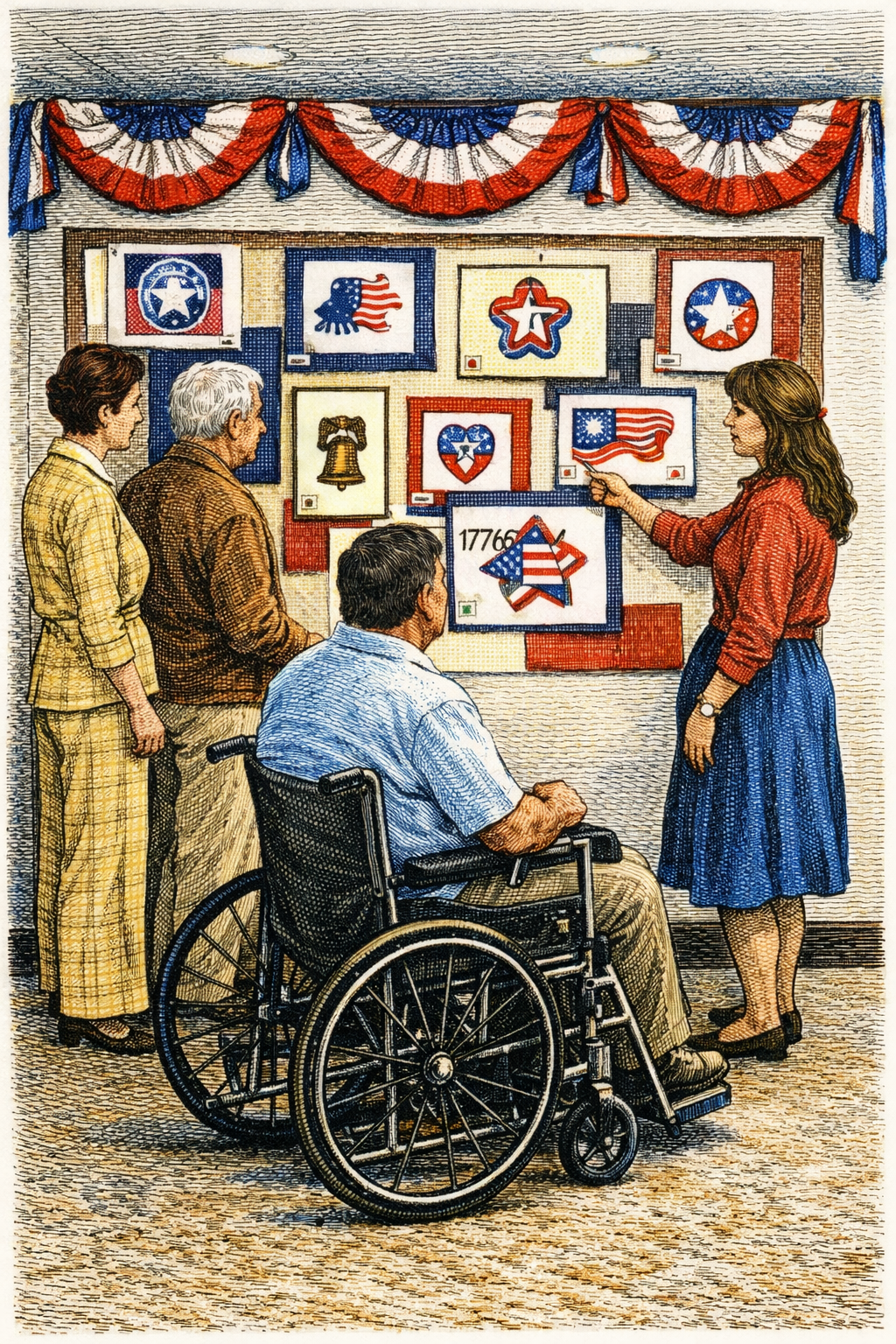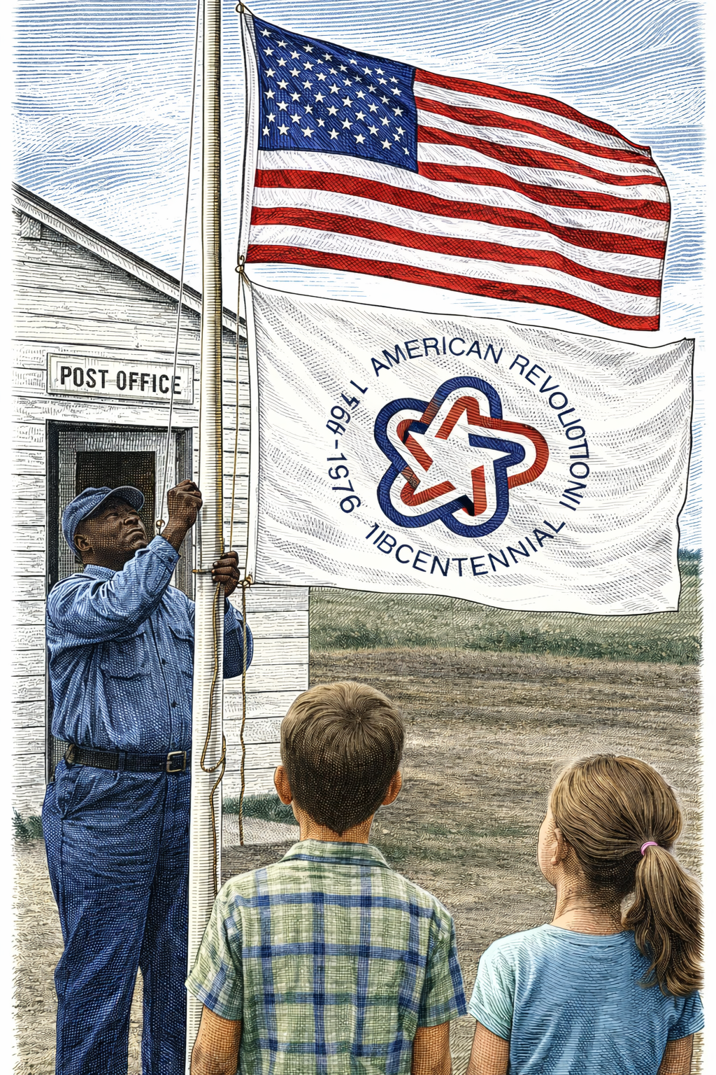 Digital illustration rendered in a fine-point engraving style with subtle colorization, created for History in Two Voices to interpret how national Bicentennial symbols appeared in everyday community life.