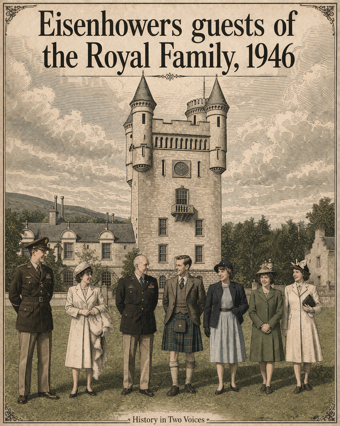 Leahy, Sharon. Ike and Mamie Eisenhower visit Balmoral, 1946. Image concept and direction. AI-assisted illustration generated using digital tools, 2026. Source inspiration: St. Louis Post-Dispatch, October 20, 1946.