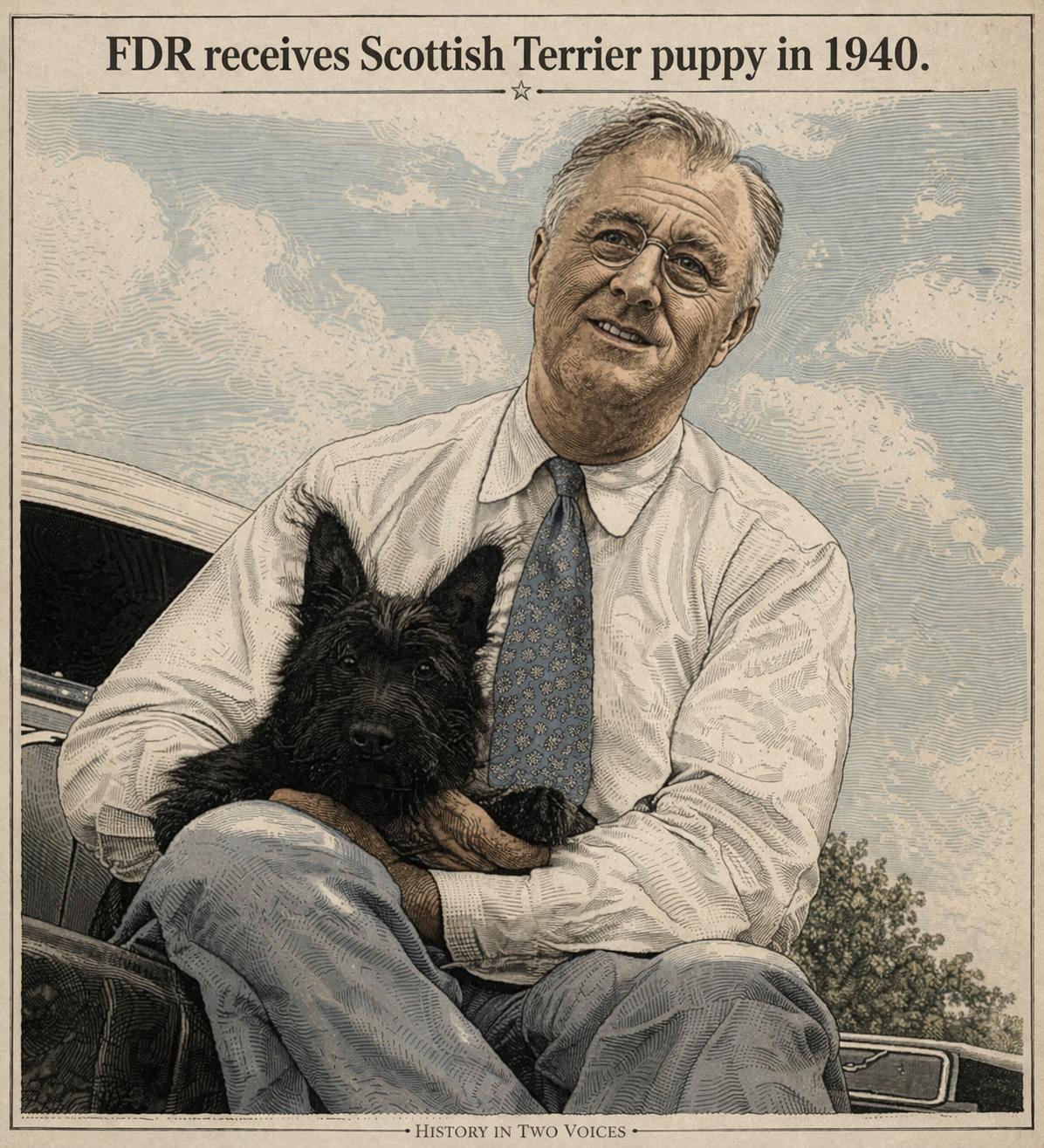 Leahy, Sharon. FDR receives Scottish Terrier puppy in 1940. Image concept and direction. AI-assisted illustration generated using digital tools, 2026.