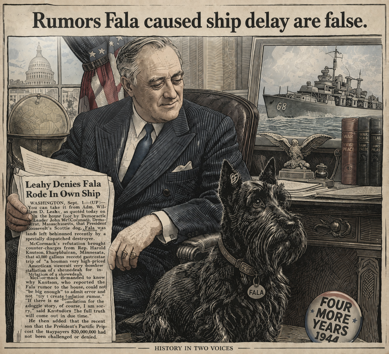 Source inspiration: “Leahy Denies Fala Rode In Own Ship.” News & Record, Greensboro, NC, September 1944. Wikimedia Commons / United Press.
