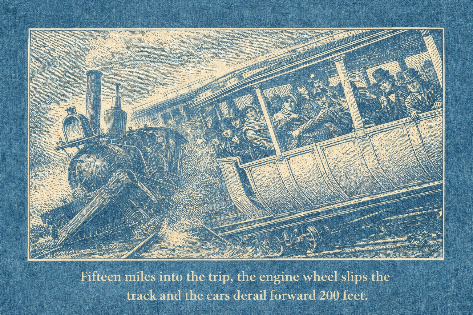 Source: Based on an engraved portrait of John Quincy Adams from the early 19th century, used for historical reference. Public-domain source material; modern composite design © History in Two Voices.Slide 2: The Train Accident Scene