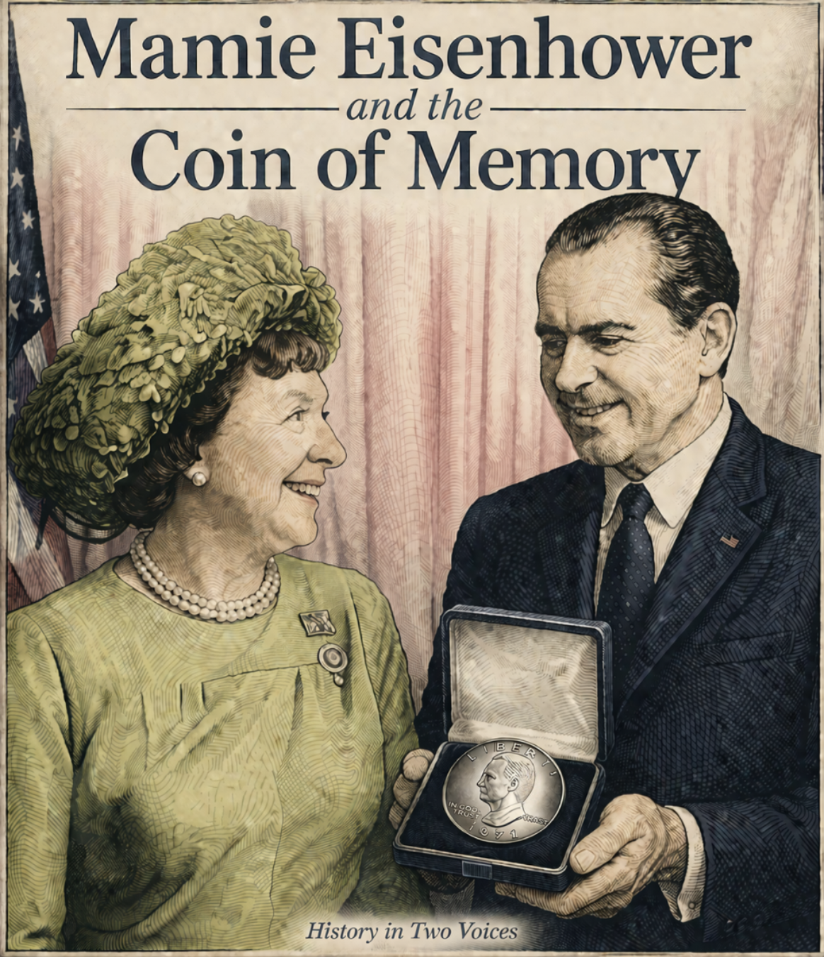 The coin featured the image of President Dwight D. Eisenhower, but it was Mamie Eisenhower, the widow of the 34th president, who held the first struck silver dollar in her hands. In a remarkable ceremony in July 1971 at the White House, President Richard Nixon personally presented Mamie with the first strike of the new coin. She wore a lime green dress, a frilly matching hat, and her signature pearls, announcing with a joyful smile, "David gets mine," referring to her grandson, David Eisenhower, married to Nixon’s daughter, Julie (The Gazette, Wichita, KS, July 28, 1971).