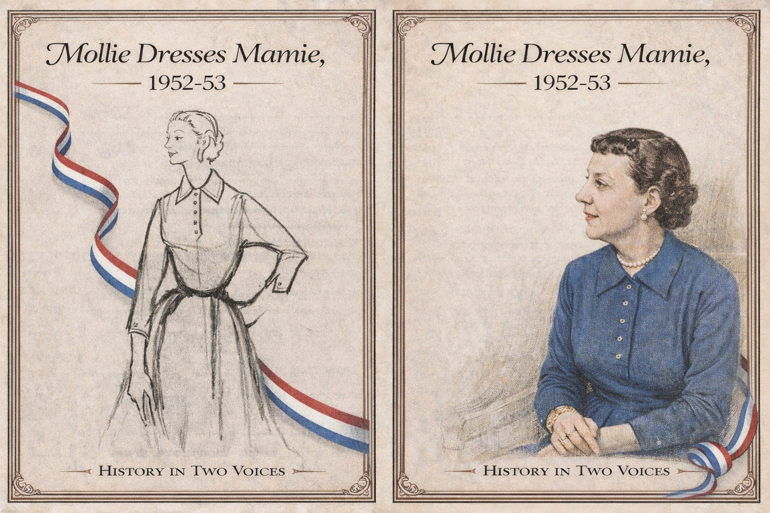 Leahy, Sharon. Mollie Dresses Mamie, 1952–53 (Convention Scene). Image concept and direction. AI-assisted illustration generated using digital tools, 2026. Source image: Mamie Eisenhower at the 1952 Republican National Convention. Wikimedia Commons.