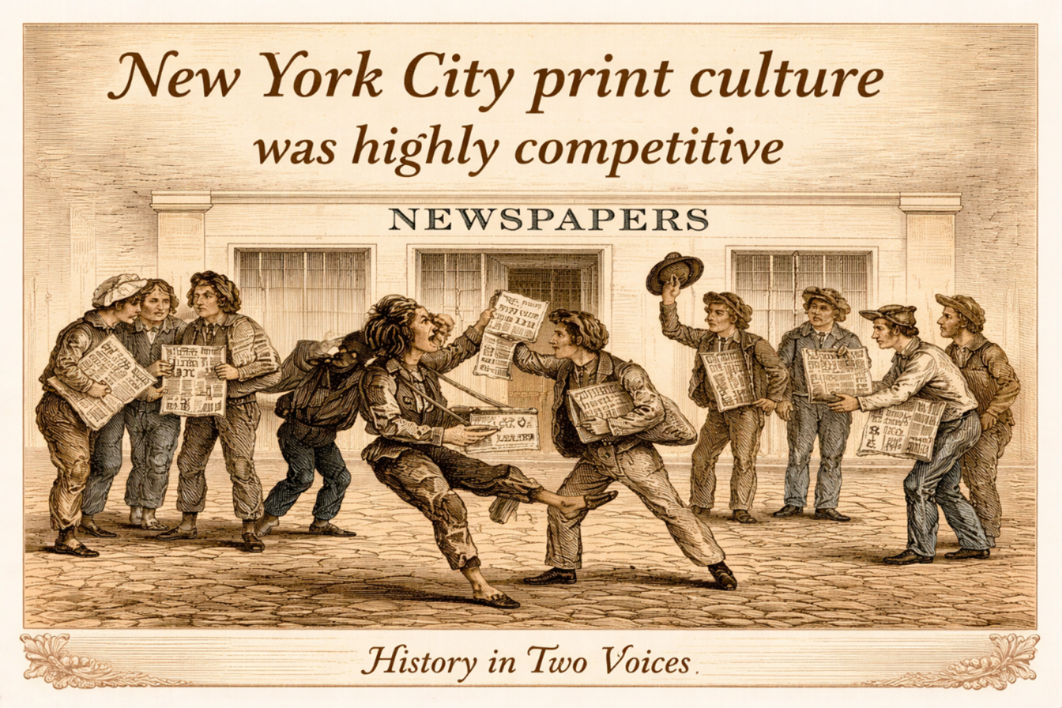"Lithograph illustrating the highly competitive print culture of 19th-century New York, with newsboys hawking 'EXTRA' editions."