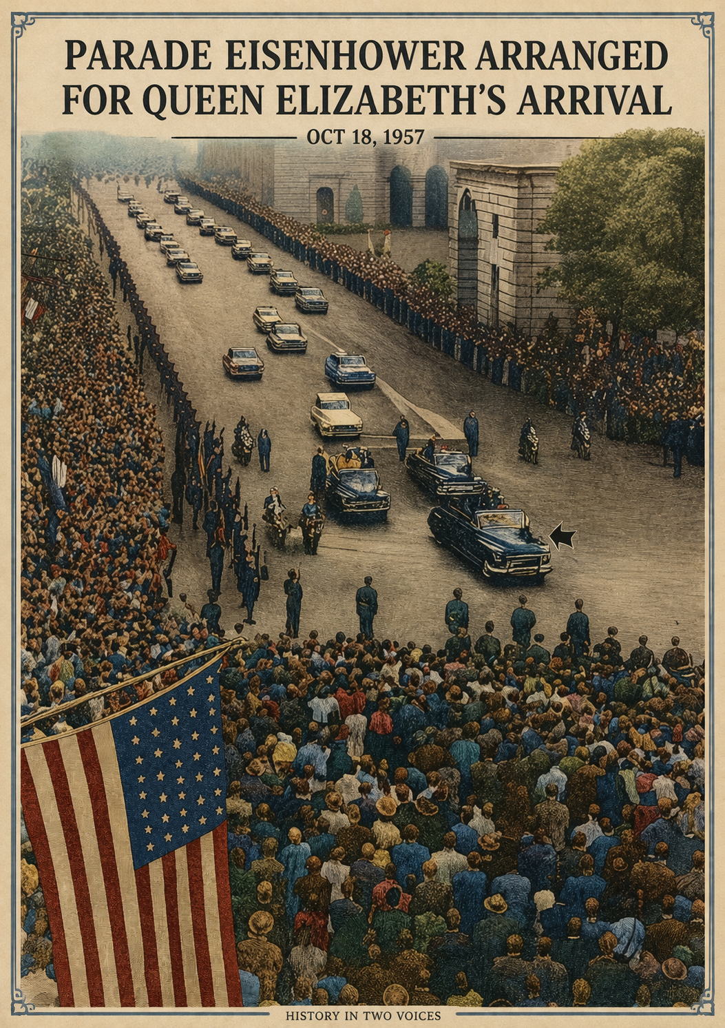 Leahy, Sharon. Parade Eisenhower arranged for Queen Elizabeth’s arrival, Oct 18, 1957. Image concept and direction. AI-assisted illustration generated using digital tools, 2026. Based on historical photograph of parade in Tennessean, Nashville, October 18, 1957.