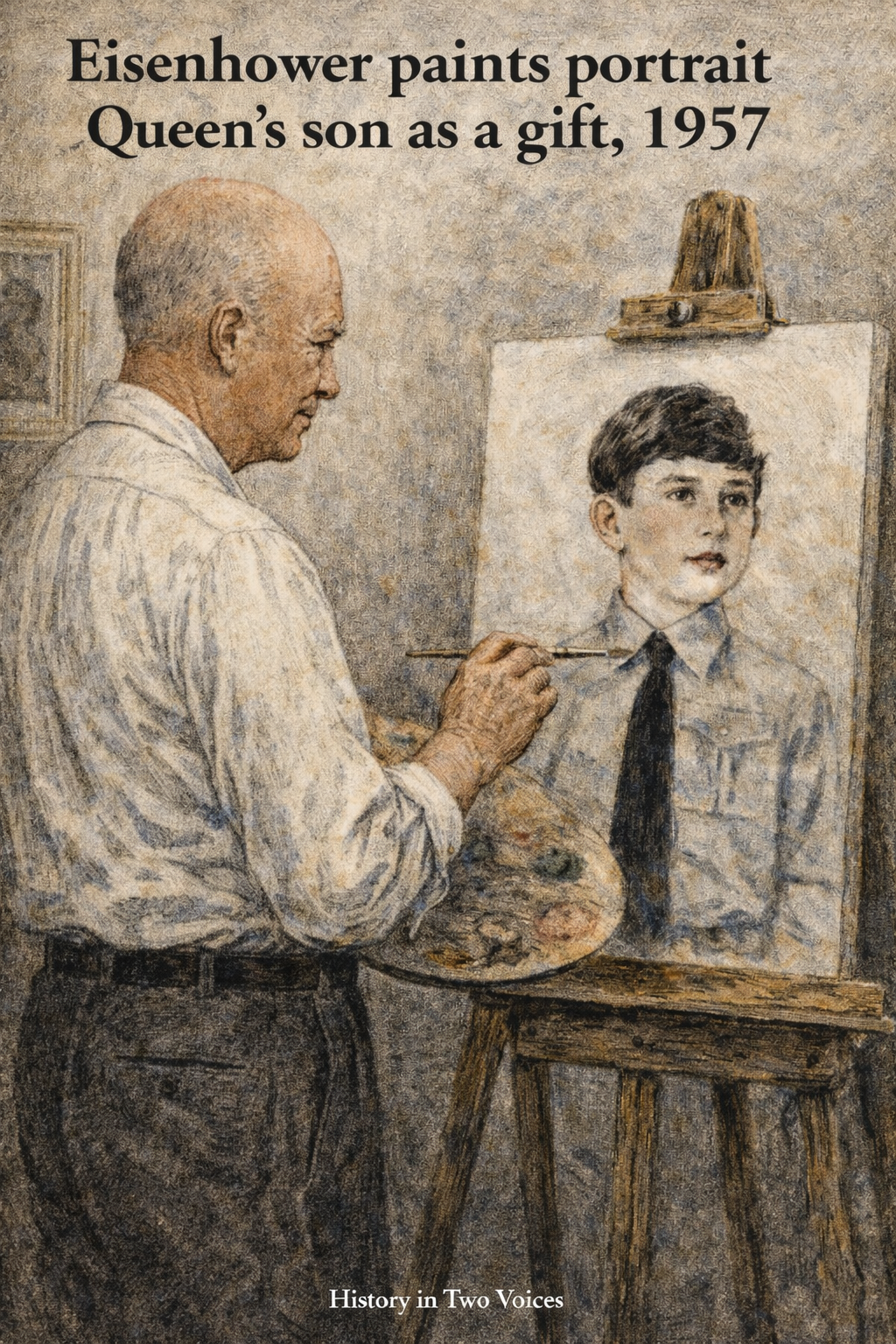 Leahy, Sharon. Eisenhower paints portrait of the Queen’s son as a gift, 1957. Image concept and direction. AI-assisted illustration generated using digital tools, 2026. Based on photograph published in Philadelphia Inquirer, October 20, 1957.
